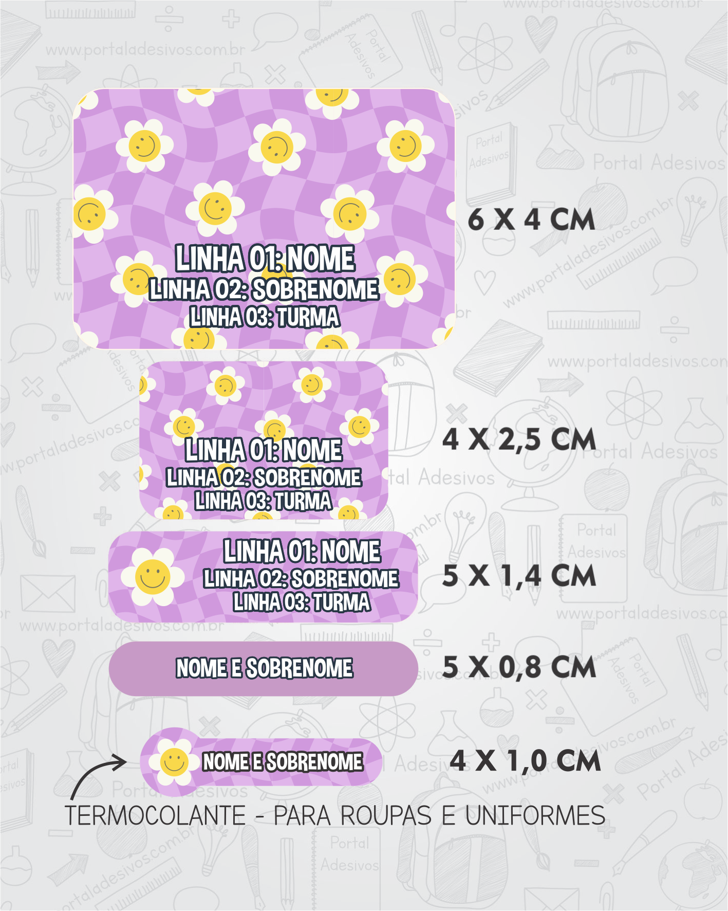 No campo “ESCOLHA O KIT” você terá a opção de comprar junto com as Etiquetas Escolares, mais 15 etiquetas termocolantes para colar nas roupas.